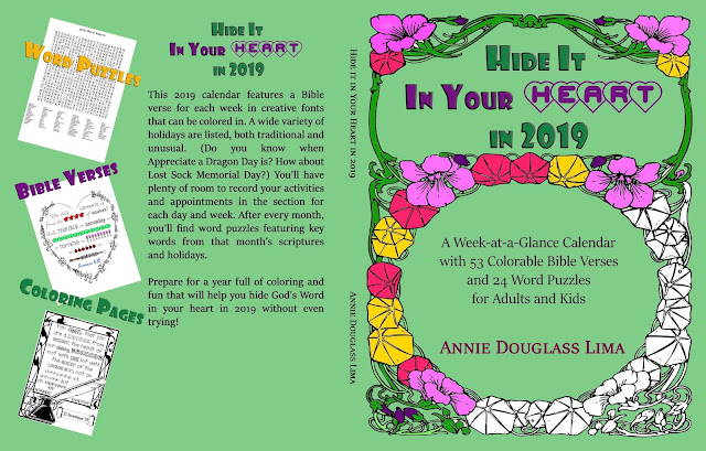 I have a treat for you today! I’m happy to showcase a cool new product by an indie author friend of mine, Annie Douglass Lima. I’ve featured her books on my blog before (you can read the posts here and here). Today’s post is all about her coloring calendar Hide It In Your Heart in 2019.Â