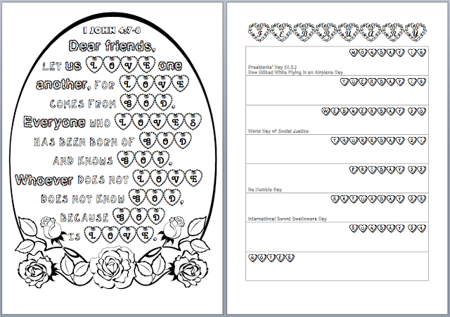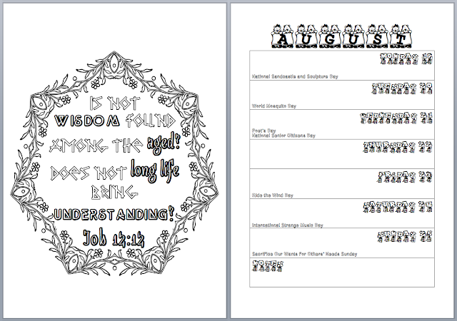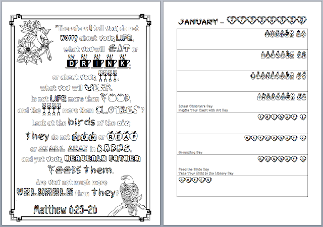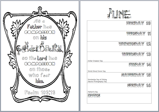 Clicking on a picture will open up a PDF of the left-hand page (just the part with the Bible verse, not the calendar week) that you can print and color.